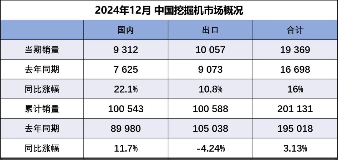 據中國工程機械工業協會對挖掘機主要制造企業統計,2024年12月銷售各類挖掘機19369臺,同比增長16%。其中國內銷量9312臺,同比增長22.1%;出口量10057臺,同比增長10.8%。2024年,…...